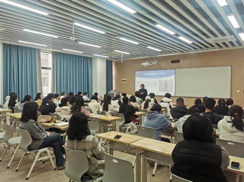 为将理论知识转化为实践能力,讲座设置了互动工坊环节。樊静选取日常交流场景案例,引导同学们分组开展影子跟读训练与即兴口语表达演练。樊静指出影子跟读法需主动捕捉语音细节,同时关注语调升降与辅音弱化现象;通过“钢琴初学者肌肉记忆”的类比,说明反复模仿可“重新编程”口腔肌肉,适应英语发音运动模式;强调“同步听与说”能高强度训练大脑语言处理能力,形成英语表达肌肉记忆。讲座还详细拆解影子跟读法五步法:第一步“盲听跟练”聚焦声音捕捉,第二步“看稿跟练”修正发音偏差,第三步“韵律跟练”模仿节奏与情感,第四步“内容跟练”结合角色扮演深化理解,第五步“复述输出”实现从“影子”到“表达者”的转变。每一步均搭配具体示例,让学生清晰掌握操作路径。