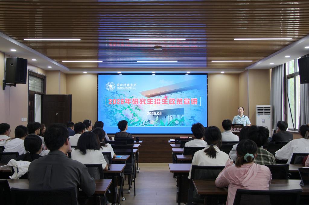 宣讲会上,胡琼从学科建设、专业特色、招生政策、培养优势、研究生就业情况等方面向与会师生详细介绍了国防科技大学及军政基础教育学院军事外语系的具体情况,充分展示了国防科技大学深厚的学术积淀、雄厚的师资力量、卓越的学术能力及有针对性的研究生培养方案。