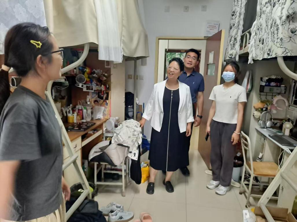 为深入了解学生思想动态和学习生活情况,进一步落实近期学生工作要求,加强宿舍安全管理,5月15日晚,外国语学院党委副书记勾小群、学办副主任王子章、团委书记杨文佳走访各年级学生宿舍,扎实做好学生管理和安全稳定工作。
