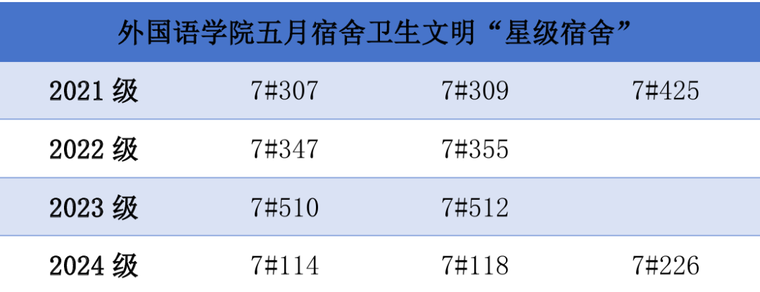 2025年5月12日至15日,外国语学院学生会权益服务部对本科生宿舍进行了卫生文明大评比,现将“星级宿舍”公示如下: