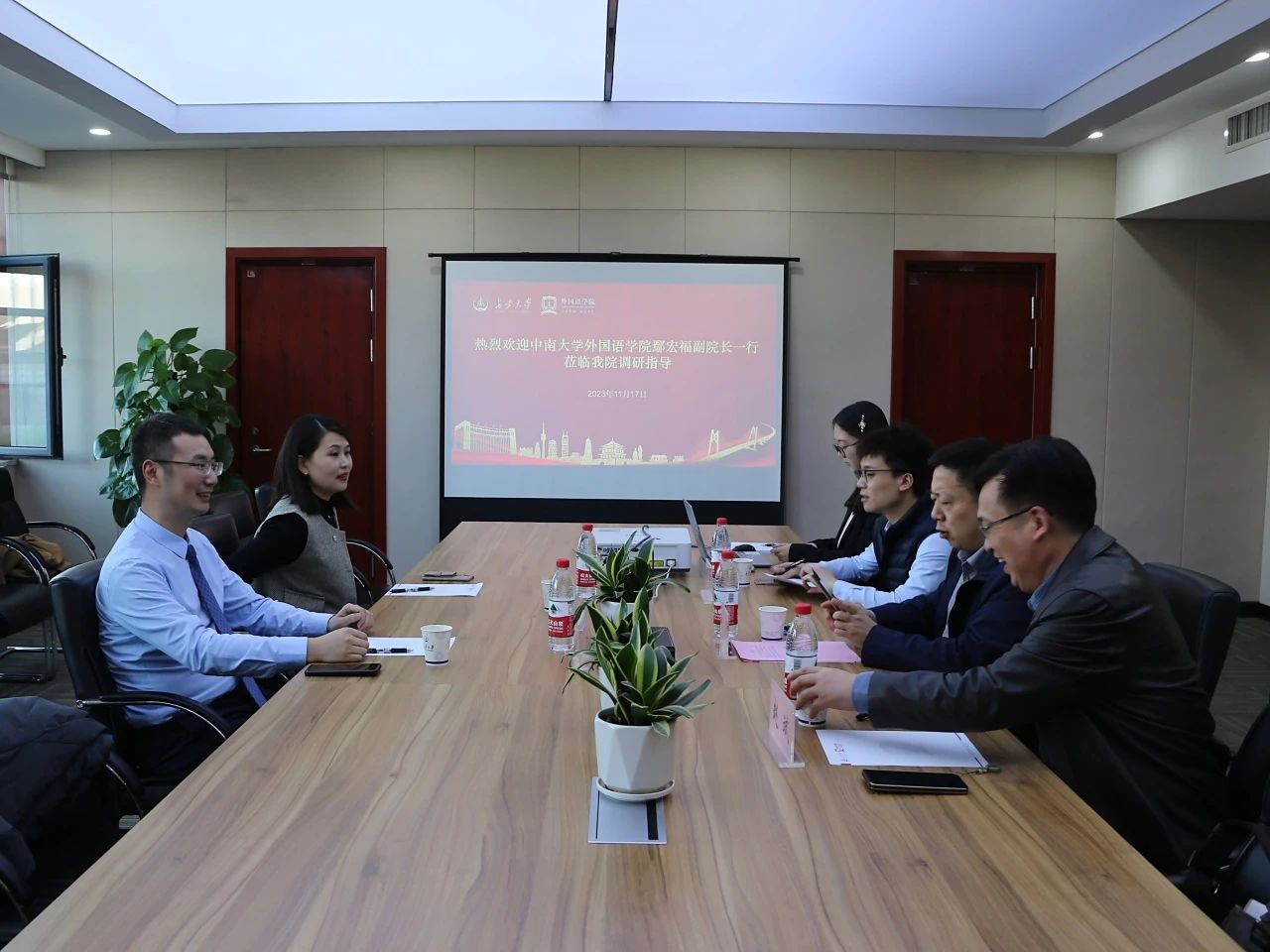 为进一步交流学科建设和人才培养经验,探索学科交叉人才培养新模式,11月17日下午,中南大学外国语学院至我院调研指导,并进行研究生招生宣讲。中南大学外国语学院副院长鄢宏福、中南大学外国语学院翻译中心执行主任郭薇,我院党委副书记宁育国、英语系主任赵斌、团委书记杨光出席,2022级、2023级全体本科生参加。