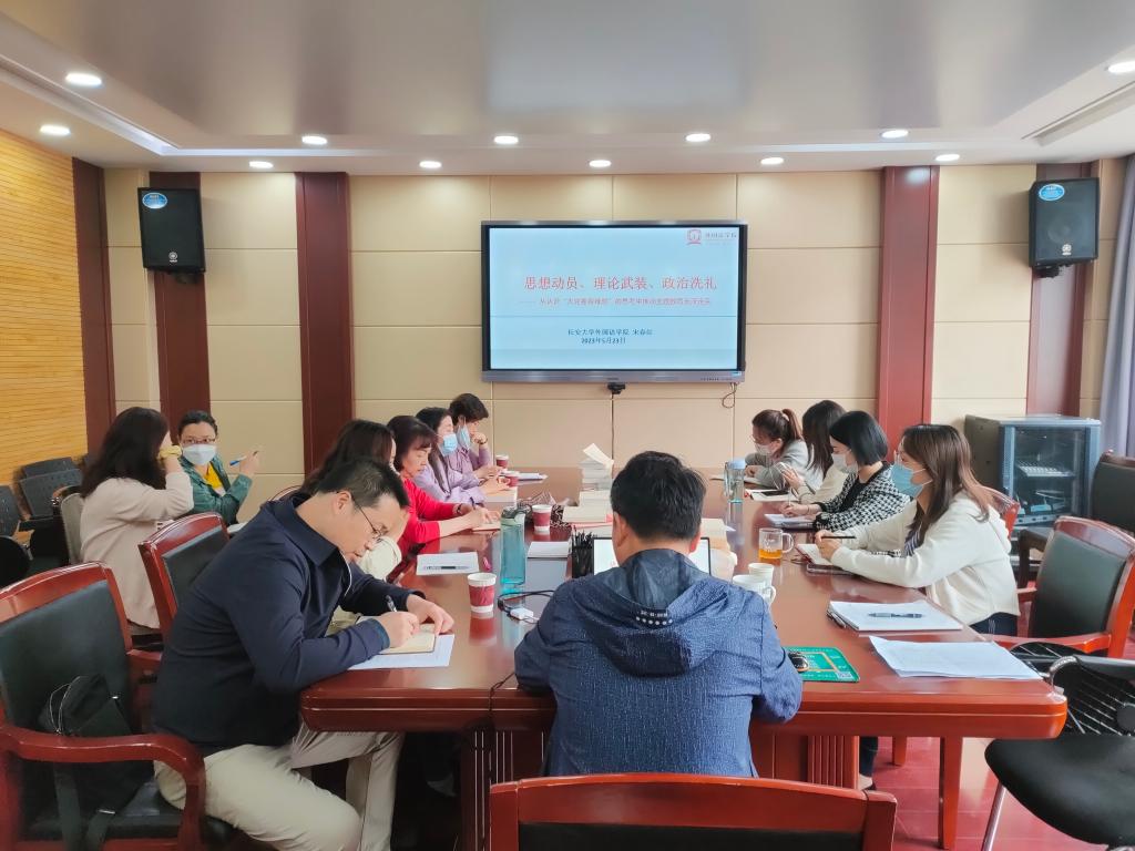 5月23日下午,在南校区基础部楼212室,外国语学院领导班子主题教育专题党课第一课开讲,党委书记宋春红作了题为《思想动员、理论武装、政治洗礼》专题党课,大英二部党支部、机关党支部全体党员参加会议,会议由机关党支部书记张侠侠主持。