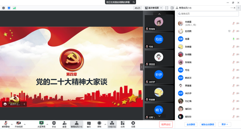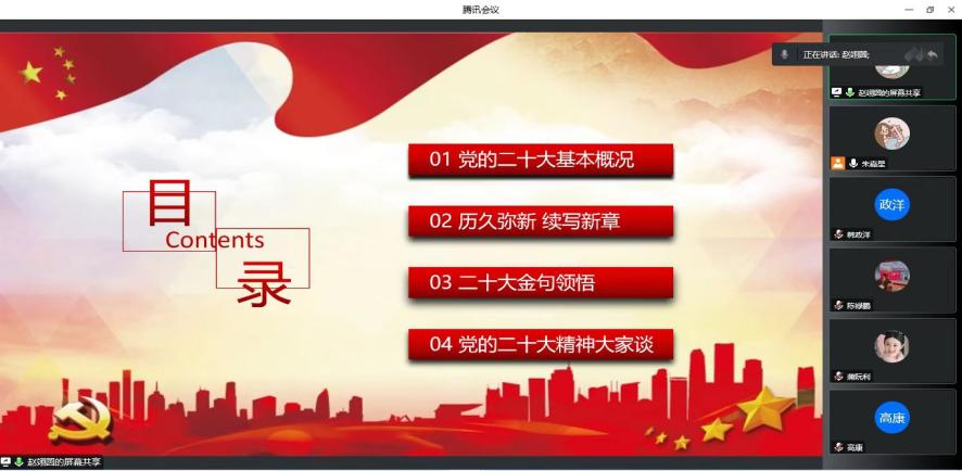 为深入学习贯彻党的二十大精神,认真领会党的二十大精神实质和丰富内涵,激发青年党员的使命感和责任感,我院研究生党支部12月7日在腾讯会议开展了“笃学党的二十大,踔厉奋发新征程”主题党日活动,党支部14名党员参加活动。本次活动由支部书记朱嘉星同志主持,支部宣传委员赵翊圆同志担任主讲人。