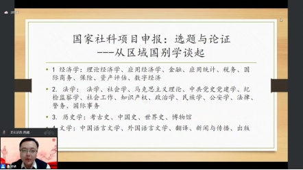 陈靓教授首先从语言学视域下的国别研究、文学视域下的国别研究、翻译视域下的国别研究三个主要方面为大家分享了国家社科项目申报在选题与论证两方面的方法和技巧。陈靓教授指出,进行申报国家社科项目时应多尝试跨学科研究,在学习以往的中标项目时,应多联想、多思考。随后,陈靓教授以七个申请国家社科的项目为例,针对性地对七个选题的进一步修改与完善提出了建议,总结了国家社科项目申报时在选题与论证两方面的注意事项。最后,陈靓教授与大家分享了自己的国家社会科学基金申报书,重点强调了在撰写课题申报书时应注意的问题。