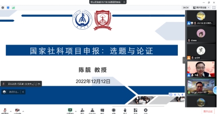 12月12日,我院举办第十五期学术沙龙,复旦大学外文学院陈靓教授受邀为我院师生作“国家社科项目申报:选题与论证”的主题分享。本次学术沙龙采取线上方式进行,由院长冯正斌教授主持,我院部分教师和全体研究生参加。