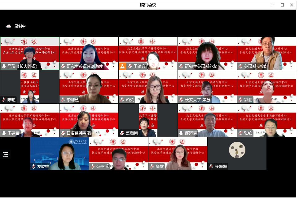 11月24日上午,我院在线上举办“北京交通大学学术英语写作中心-长安大学交通强国语言服务协同创新中心”座谈会。会议由副院长马瑛主持,北京交通大学语言与传播学院郝运慧副院长,学术英语写作中心主任王建荣教授,我院学术分委员会委员刘海萍副教授及双方教师代表参加了会议。