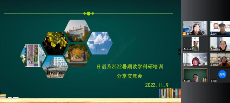 2022年11月9日下午,日语系举办了2022暑期培训分享交流会。由胡海燕、郭亚军、李国玲三位暑期参加培训的老师分别做了分享。本次分享活动采取线上方式进行,日语系主任韩春娟主持,日语系全体教师及其他各系部老师参加。