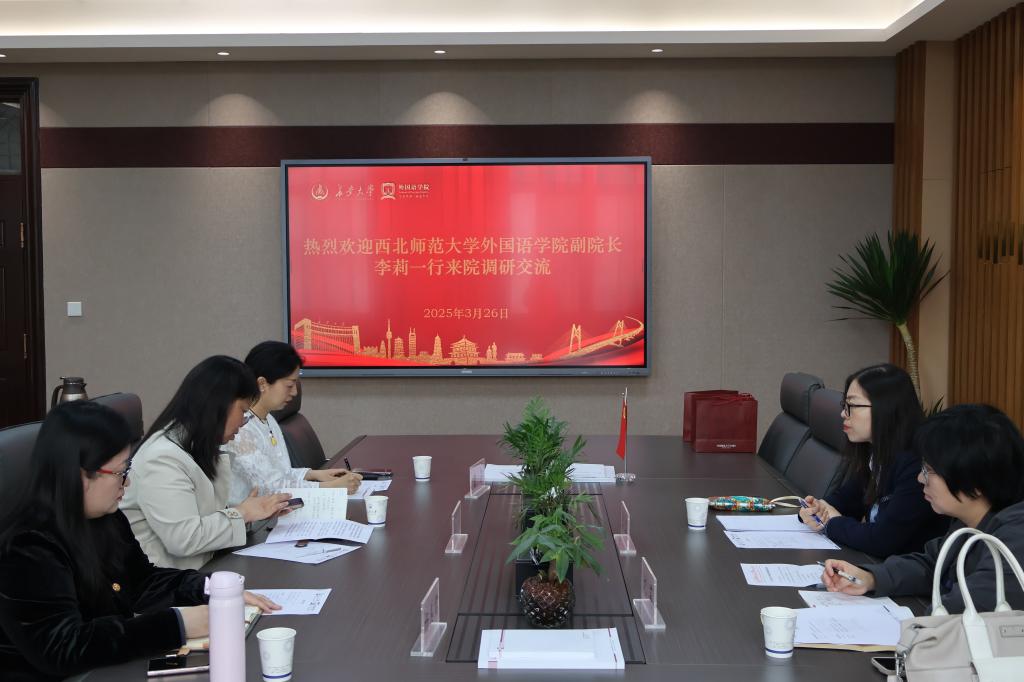 为促进高校间的教学交流与合作,3 月 26 日上午,西北师范大学外国语学院副院长李莉一行两人来我院参观调研。我院党委副书记勾小群及大英二部负责人参加了此次调研交流会,双方就大学英语教学改革、师资培育、课程建设等议题展开了深入交流。