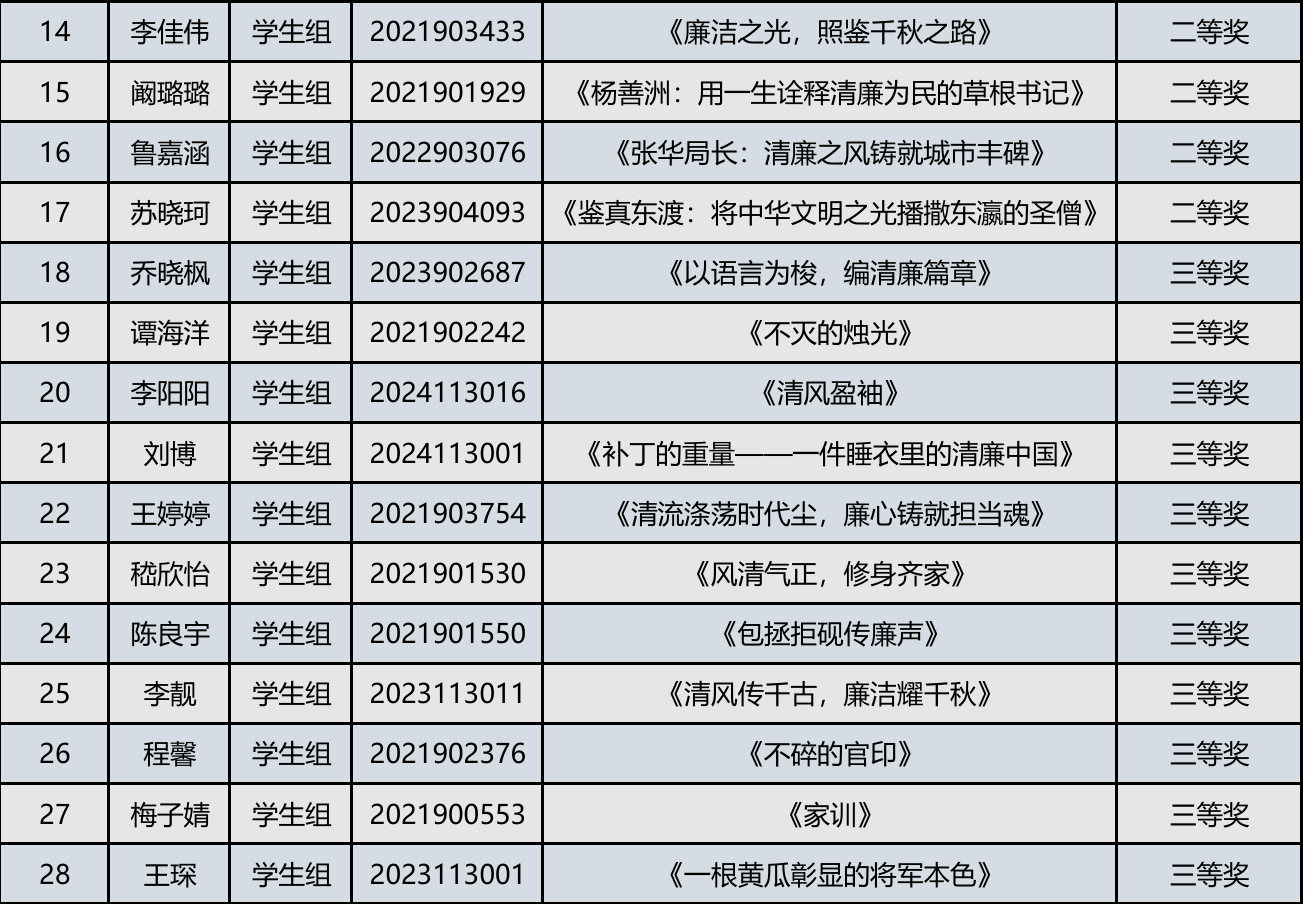 本次廉洁文化征文比赛的成功举办,不仅为外语学院营造了崇廉尚洁、风清气正的文化氛围,更以文字的力量传递了廉洁从政、诚信做人的价值理念。参赛作品主题鲜明、立意深刻,既有对历史廉政典范的深入解读,也有对新时代廉洁精神的生动诠释,充分展现了参赛者以笔为镜、以文载道的责任担当。下一步,学院将持续深化廉洁文化建设成果,通过优秀作品展览的形式,让清廉之风浸润人心,为推进全面从严治党向纵深发展注入持久的文化动能。