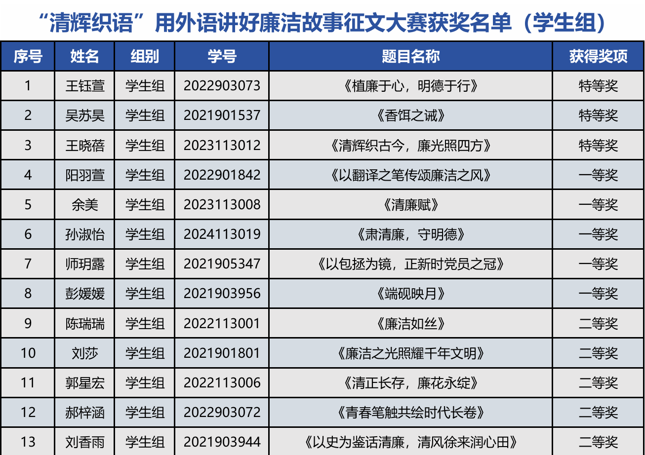 为深入学习贯彻党的二十大精神,推进新时代廉洁文化建设,提升外语实践应用能力,外国语学院举办“清辉织语”用外语讲好廉洁故事征文大赛。在学院党委的指导以及广大师生的积极配合下,选手们通过多元语言的魅力,共同挖掘中华文化中蕴藏的廉洁智慧,用廉洁文化固本培元,展现新时代清廉尚洁的精神风貌。