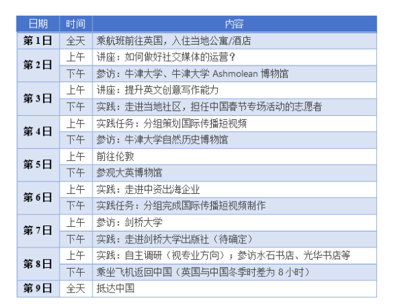 备注:具体日程需根据签证和国际航班时间以及国内衔接联程航班相应调整;课程和参访顺序可能有调整。